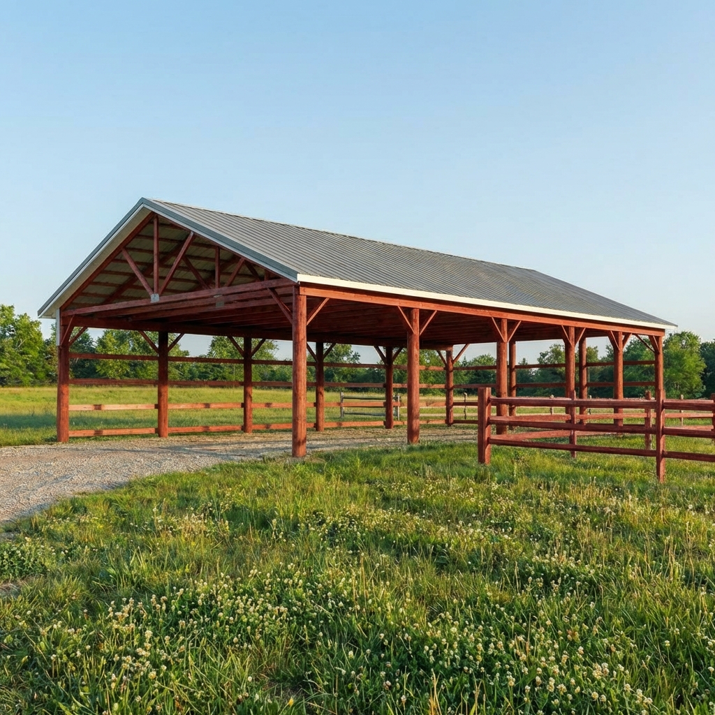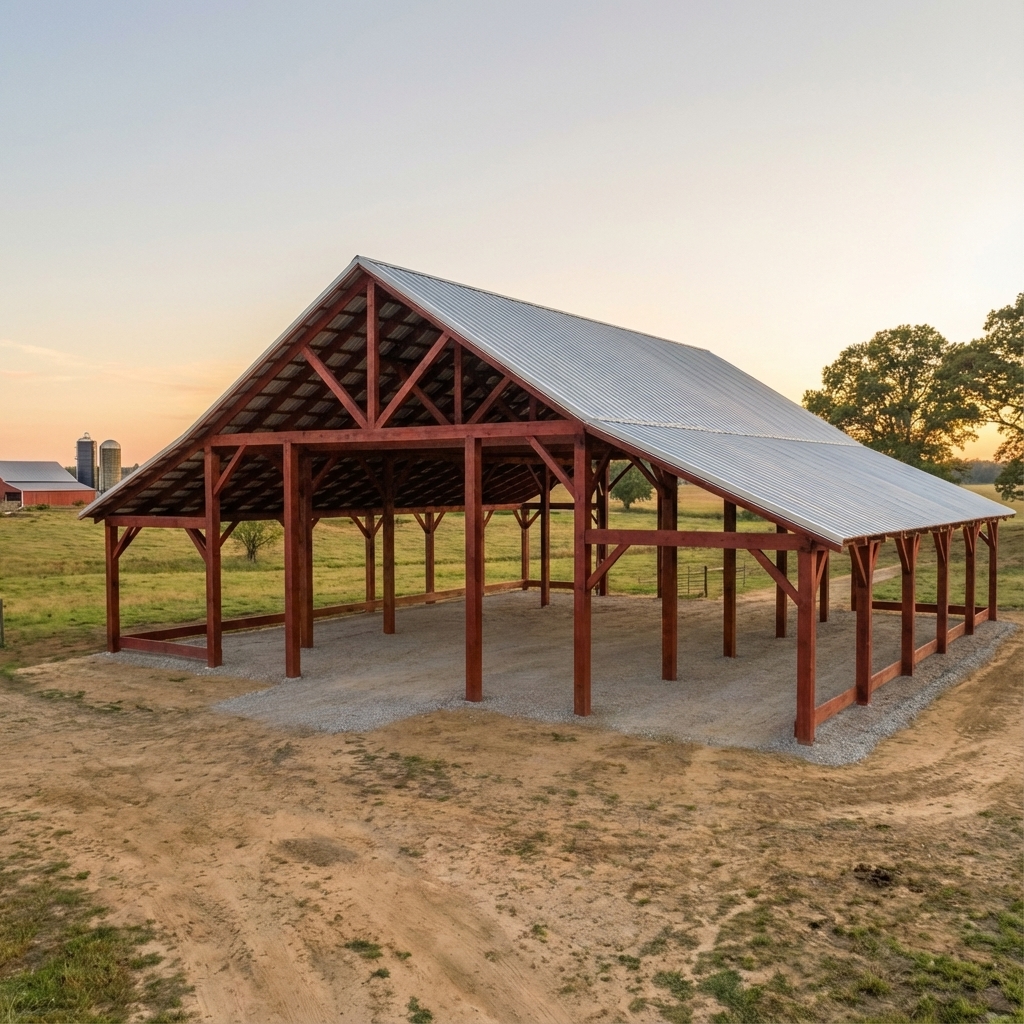 We use pressure-treated lumber for posts and high-quality metal roofing and siding designed to withstand Alabama’s weather. We typically install 29-gauge metal roofing, with an option to upgrade to heavier 26-gauge for added durability. With proper care, your pole barn or shed can last 30-40 years or more.